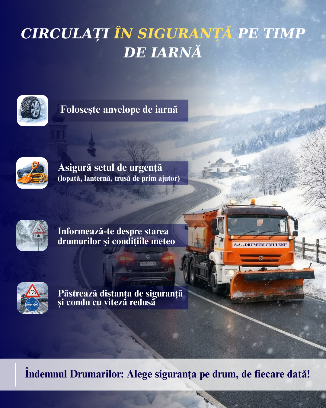 - monitorizarea continuă a stării drumurilor și semnalizarea zonelor cu risc.