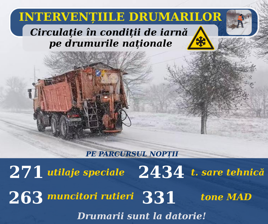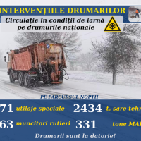 Pe parcursul nopții, 271 de utilaje speciale și 263 de muncitori rutieri au fost mobilizați și au acționat în regim non-stop pe întreaga rețea de drumuri naționale, cu prioritate pe tronsoanele unde circulația s-a desfășurat cu dificultate, sectoare de drum expuse viscolirii și înzăpezirii din cauza vântului, precum și în pante sau curbe periculoase.
