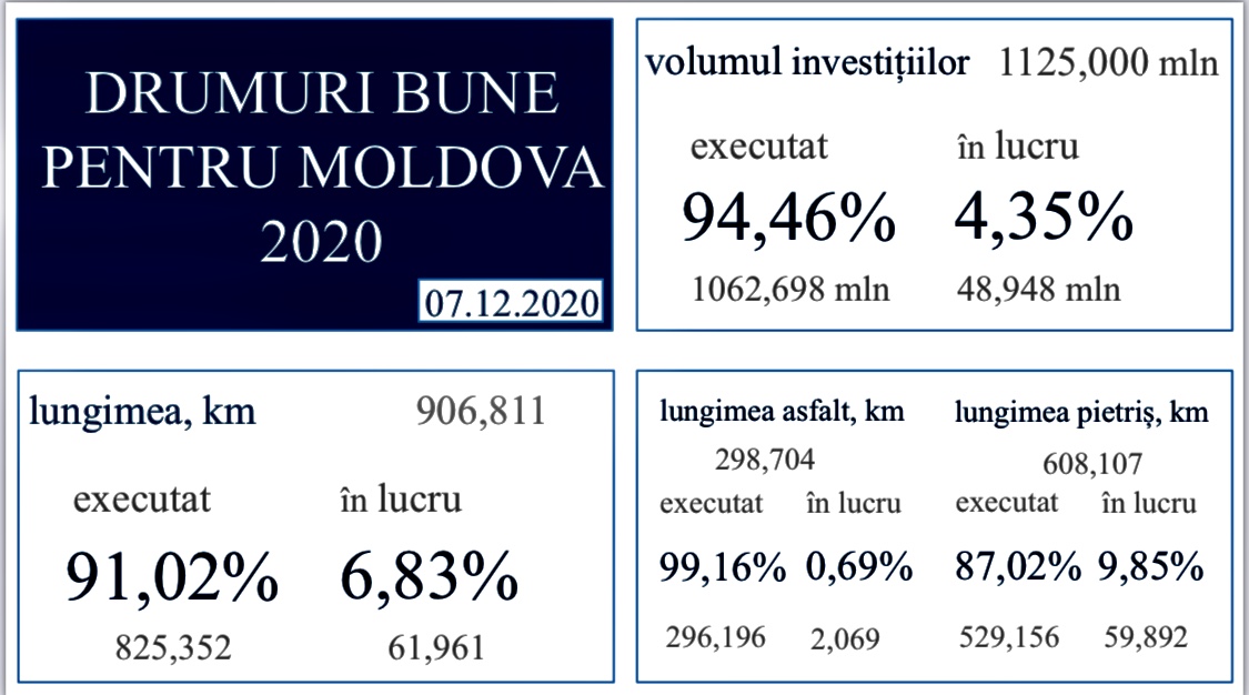 Până în prezent, pentru reparația drumurilor din cadrul programului au fost cheltuiți peste 1,062 miliarde de lei cu un progres al lucrărilor de peste 94%.