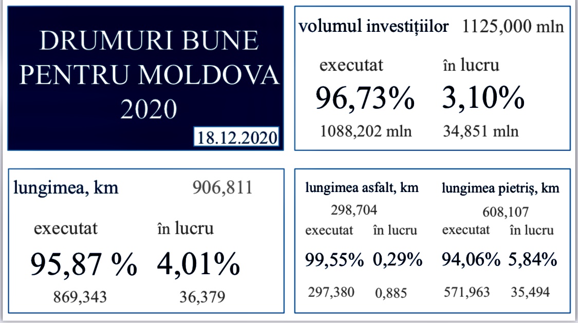 Până în prezent, pentru desfășurarea lucrărilor, din bugetul de stat au fost cheltuiți peste 1,088 miliarde de lei. Astfel, au fost reparați circa 869 km de drum, dintre  care peste 297 km cu îmbrăcăminte din beton asfaltic și peste 571 km cu îmbrăcăminte rutieră din pietriș.